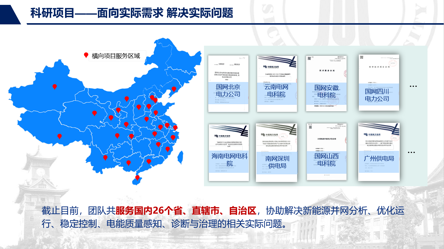 电能质量与优质供电团队,始建于1970年代,是我国最早的电能质量团队之一,是四川大学“创新2035”五大先导计划、“双一流”超前部署学科的重要支撑团队。团队依托智能电网四川省重点实验室、电能质量与电磁环境学省级重点实验室,肖先勇教授、杨洪耕教授、徐文远教授(四川大学高端外籍教师,每年在川大工作3月)为团队学术带头人。近几年,团队承担国家重点研发计划、国家自然科学基金(重点、面上、青年)、省部级和国网、南网等项目60多项,年科研经费2000多万元,发表SCI论文120余篇,授权专利62项,编制国际标准、国家标准、行业标准共12项。获省部级奖9项,其中四川、江苏省科技进步奖一等奖各1次,中国电力创新奖一等奖1次,中国专利奖优秀奖1次。成果应用在全国21个省级电网,包括北京冬奥会、成都世乒赛、成都大运会等重大活动,西电东送、清洁能源消纳、卫星发射等国家重大工程。获电能质量领域最有影响力的IEEE ICHQP 2024年主办权,该会议首次在中国大陆举办。团队被IEEE Fellow、电能质量国际知名学者Math Bollen评价为“leading group”。