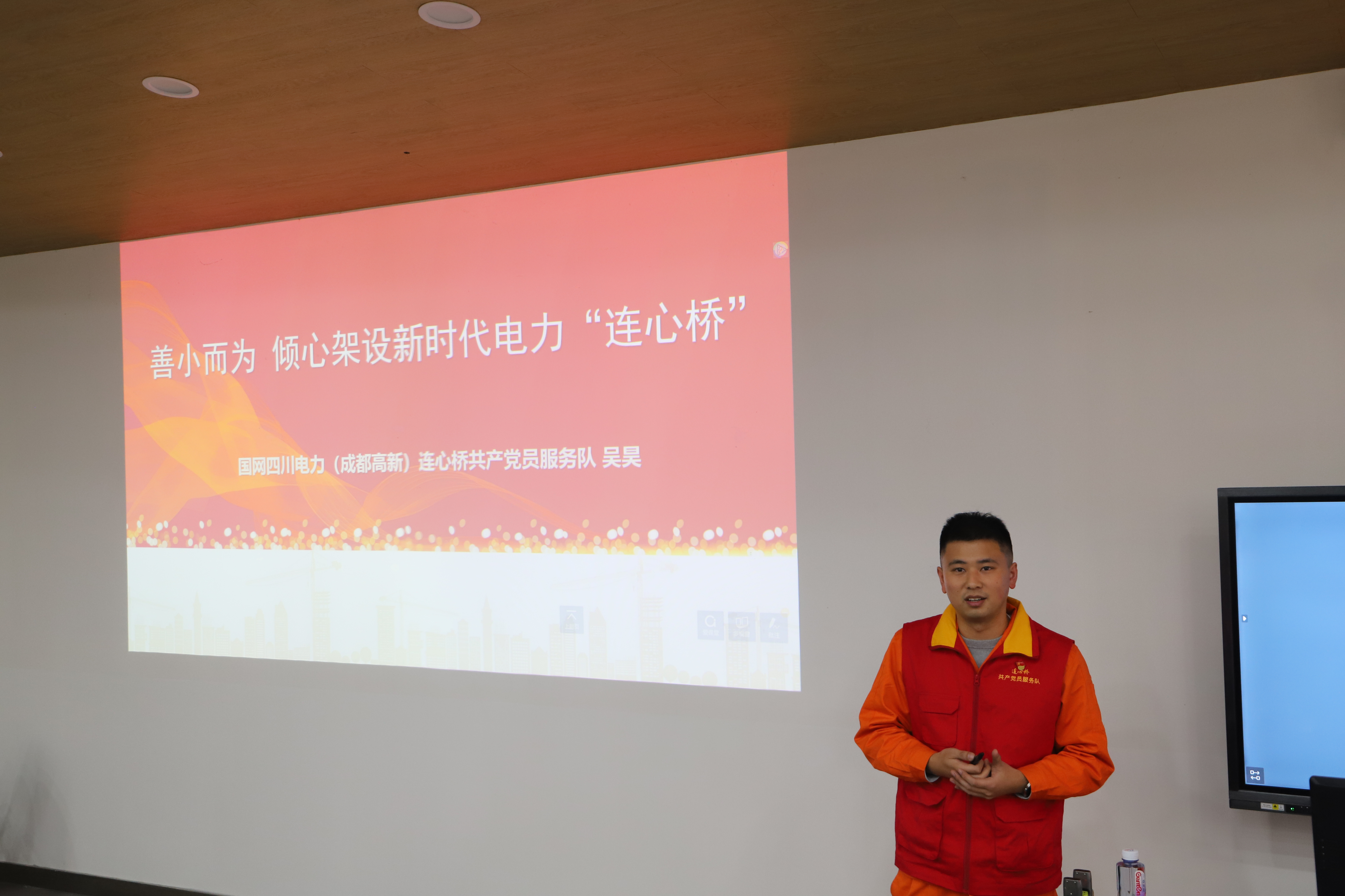 随后,高新供电公司党员服务队队长吴昊分享了党员服务队的先进事迹和心得体会。高新党员服务队二十一年来秉持“有呼必应、有难必帮”的服务承诺,以“一个党员就是一面旗帜,一支队伍引领一个群体”为主题,从牢记嘱托、践行宗旨、善小而为、为民造福4个方面,讲述党员服务队做好政治服务、抢修服务、营销服务、志愿服务、增值服务的故事,充分展现高新共产党员服务队“做好电力先行官,架起党群连心桥”的队伍精神,以此引领广大党员干部、人民群众接续加入到为人民服务的行动中来。