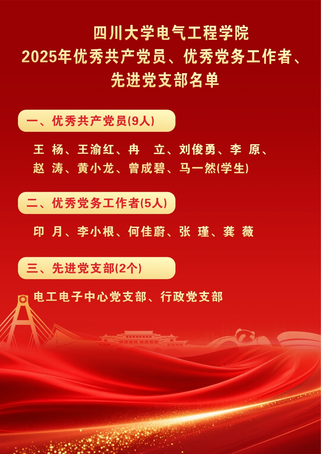 高质量发展作出积极贡献的全体教职工表示感谢,向受到表彰的先进集体和个人表示祝贺。他说,我们要以伟大建党精神汇聚推动发展的磅礴力量,持续强化“五个更加有力”,以高质量党建引领保障高质量发展。一是强化政治引领更加有力,深入贯彻落实党中央和学校党委各项决策部署;二是创建“三个一流”更加有力,奋力打造一流领导班子、一流党支部和一流党员队伍;三是推动互融互促更加有力,将党旗插在人才培养和科研创新最前沿,将党员先锋模范作用体现在教学科研、人才培养和服务保障第一线;四是坚持作用发挥更加有力,牢记自己的第一身份是共产党员、第一职责是为党工作;五是推进全面从严治党更加有力,坚持把作风建设融入日常工作,发扬自我革命精神,守牢红线底线,奋力答好“建设一流,电气何为”的时代答卷。