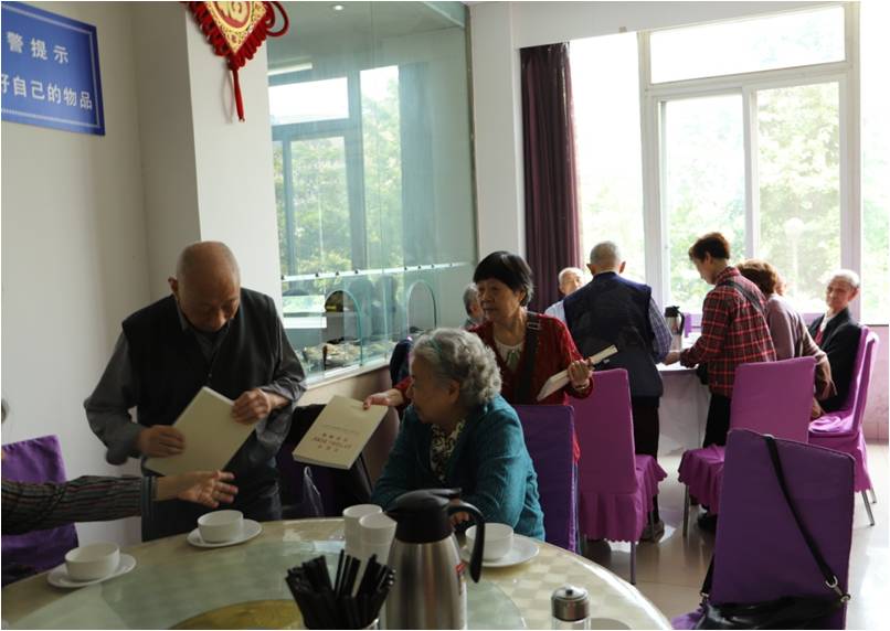党委书记韩芳、院长肖先勇、党委副书记兼纪委书记张英敏、院长助理李成鑫、工会主席黄顺良、党政办主任邓丽华来到活动现场,与退休支部书记胡淑群、张世三一起将书籍逐一发放到退休党员手中。
