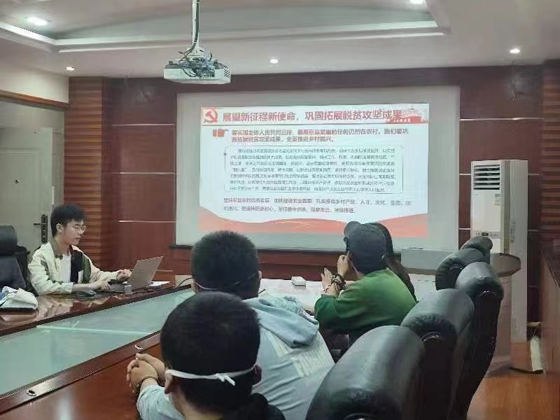 分团的刘浩然同学应邀以“全力以赴巩固拓展脱贫攻坚成果”为主题为支部党员们作报告。他首先强调全面建设社会主义现代化国家的重要性,通过生动的案例和实际经验,分享了脱贫攻坚工作中的成功实践和宝贵经验,并号召大家以身作则,积极投身到巩固拓展脱贫攻坚成果同乡村振兴有效衔接的工作中,为实现中华民族伟大复兴贡献自己的力量。
