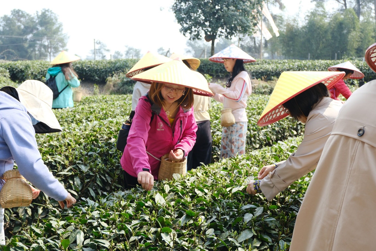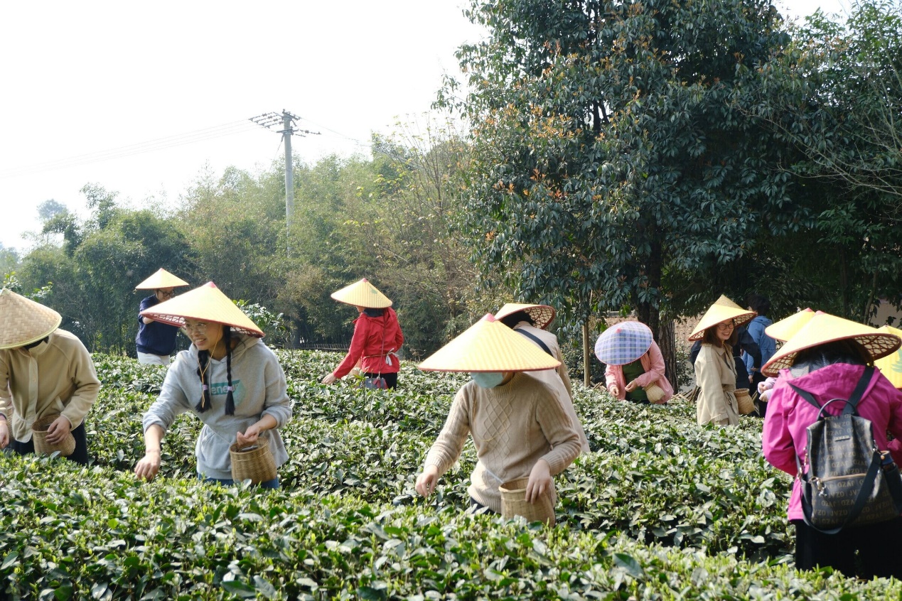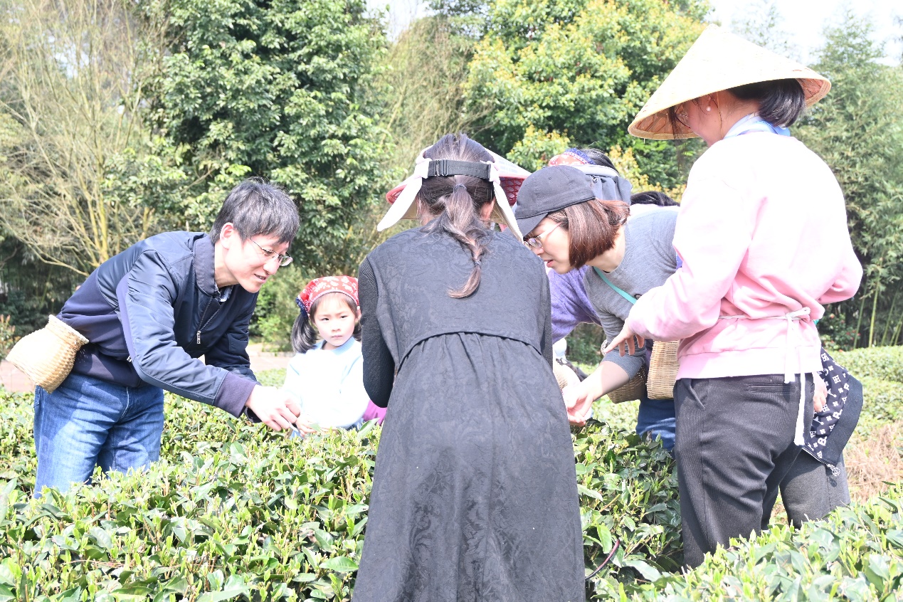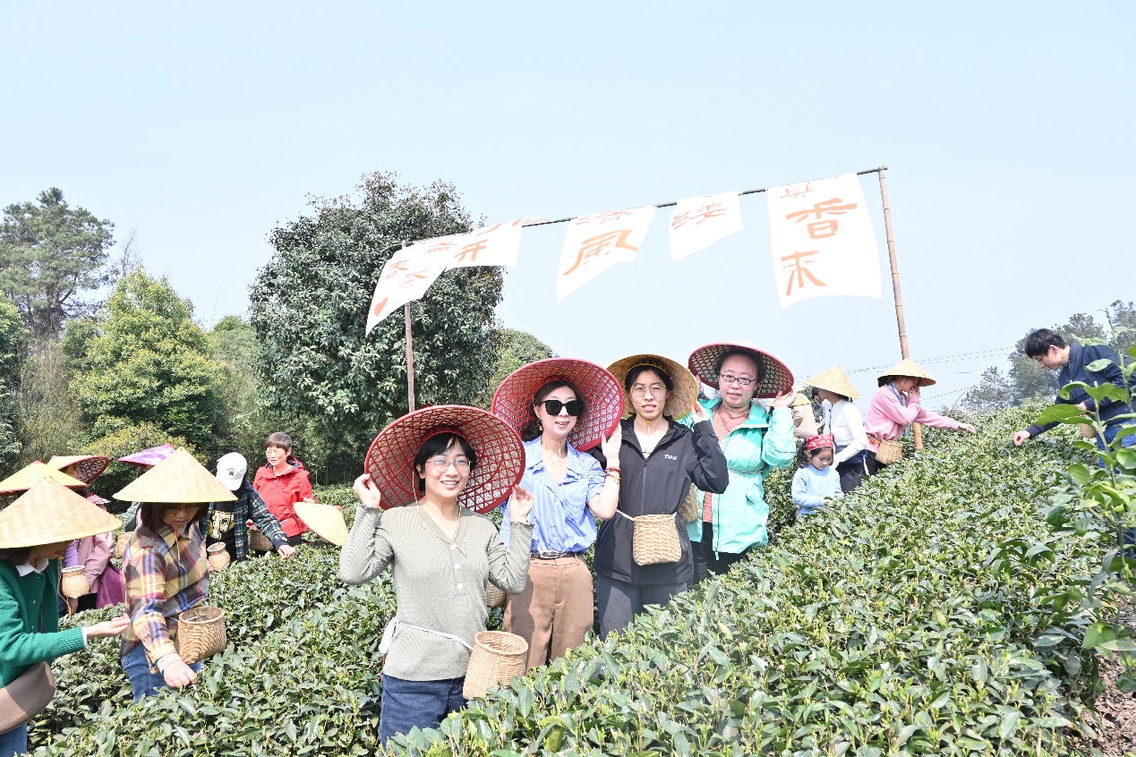 50余名女教师代表卸下繁重的工作,走进四川省首批省级乡村文化振兴样板村——蒲江明月村。在当地工作人员的指导下,大家纷纷背上茶篓,穿梭于茶园中,开始采茶之旅。