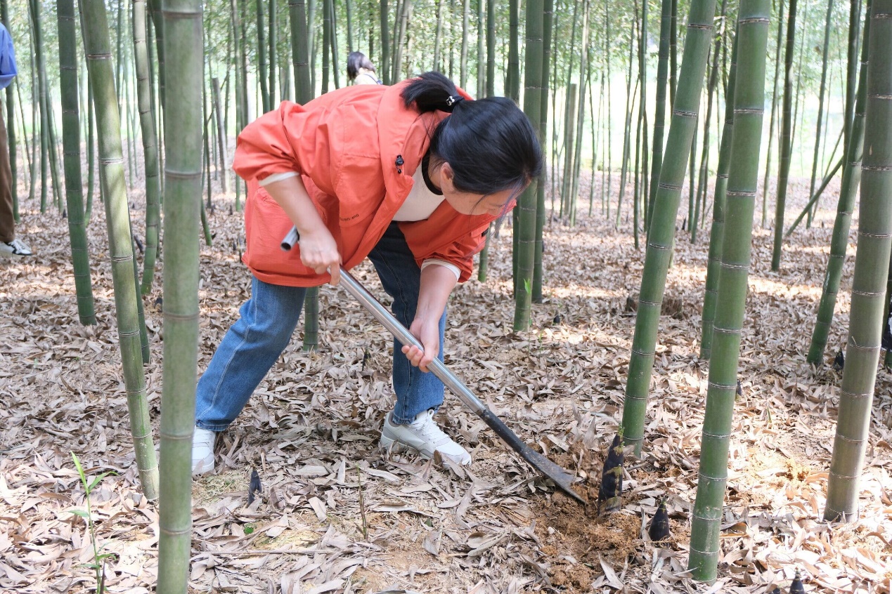 当地工作人员将挖笋小组的老师们带领到茂密的竹林,现场演示如何标准化采笋及竹笋采挖技术要领。看着一颗颗刚刚破土而出的竹笋,激发了老师们劳动的热情,大家拿起铁锹,开始挖笋,一个个干劲十足,用自己辛勤的汗水诠释了劳动的价值。