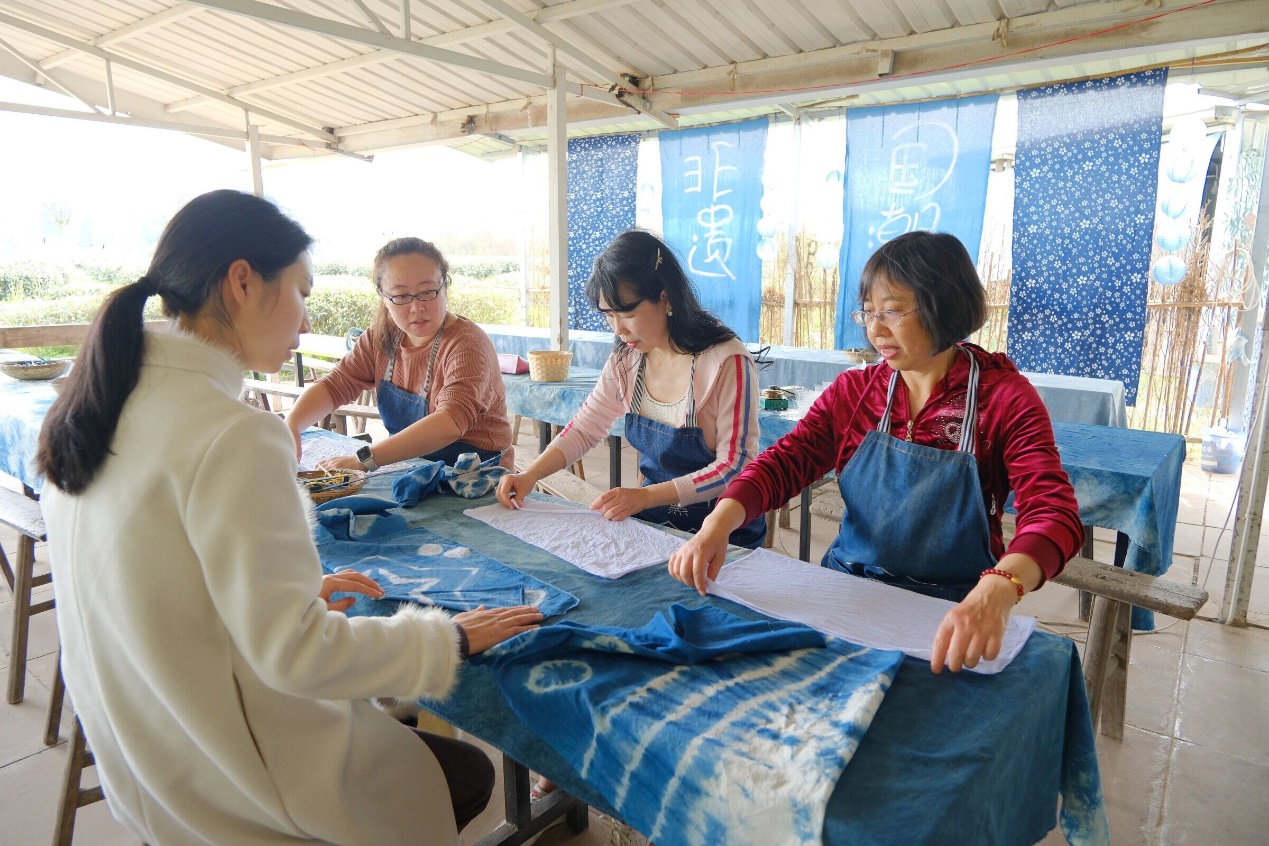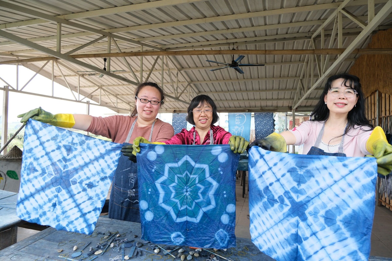 扎染小组的老师们来到染坊体验馆里感受“至白至蓝”的扎染技艺。听完工作人员的解说后,大家开始搓皱、折叠、翻卷、挤揪……以洁白布匹为载体,用植物染料浸染,一番操作后,一件属于自己的扎染手工艺品就完成了,图案各异,姿态万千,老师们都露出了满意的笑容,并将作品高高举起,向大家展示,体验馆里洋溢着欢声笑语。