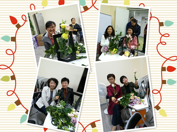 女教职工们进行插花艺术指导。
