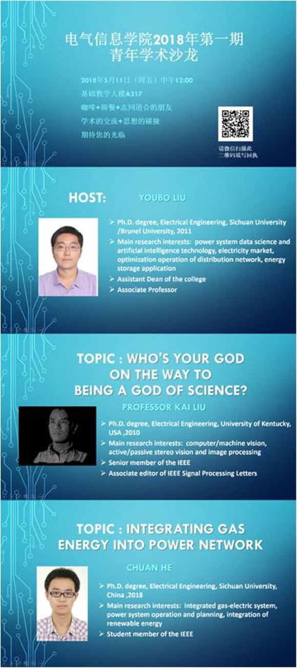 刘友波院长首先做了会前发言,他感谢007足球 青年教师们对此次学术沙龙的广泛支持和响应,希望大家能借此在学术上广泛交流,碰撞出新思想的火花,增加大家之间的合作。随后,刘凯教授做了主题报告,以自己的科研学术成长经历鼓励大家勇敢工作,多方合作。何川博士生报告了自己在电力系统运行规划、可再生能源整合方面的最新成果。