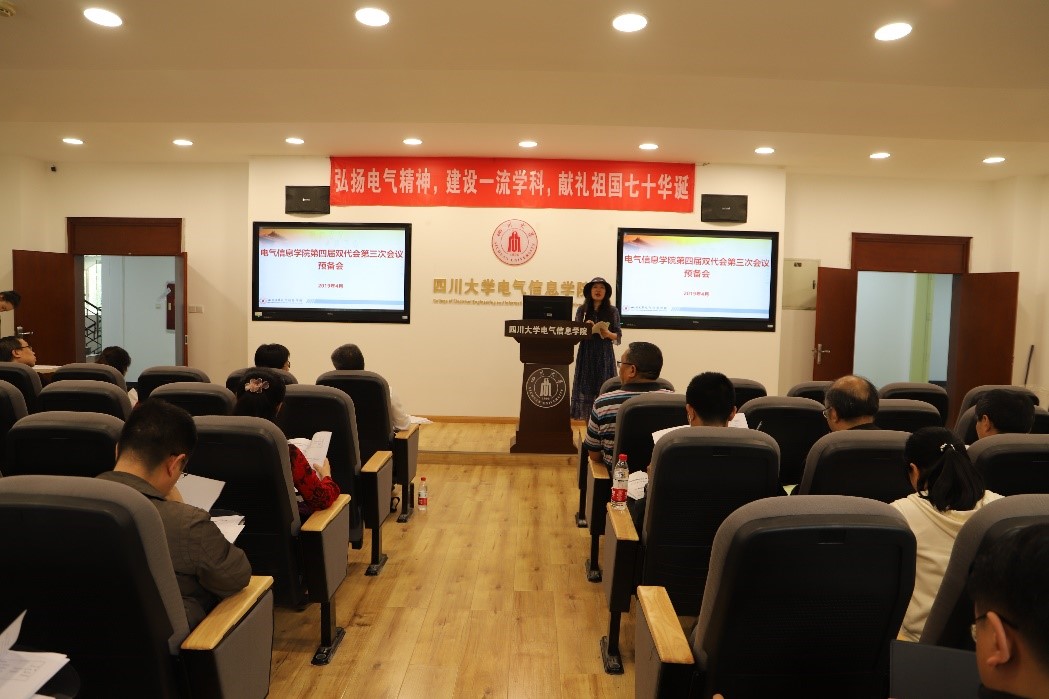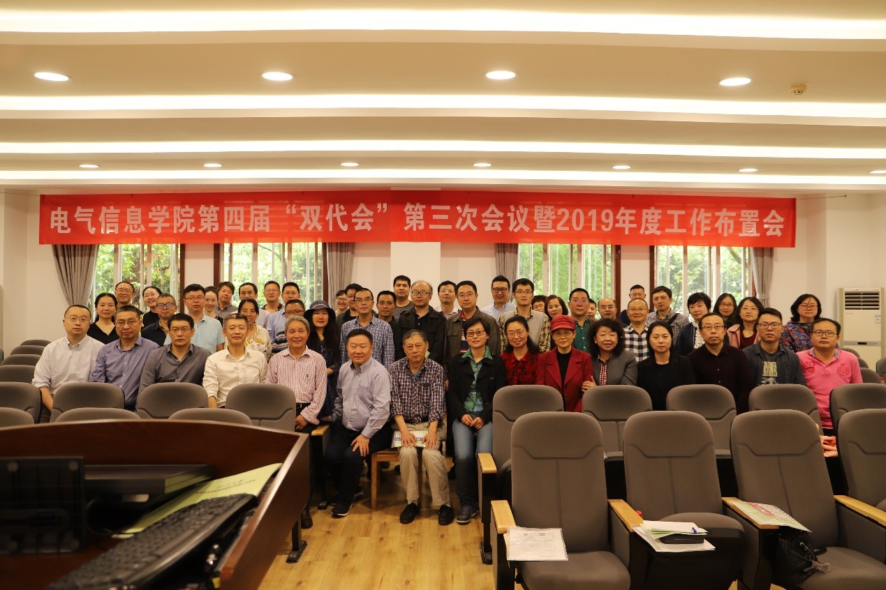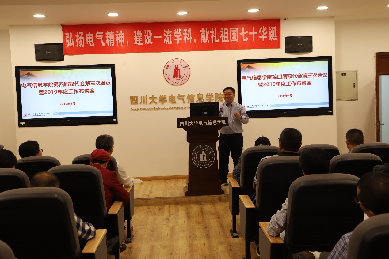 2019年4月19日下午,电气信息007足球 第四届“双代会”第三次会议暨2019年度工作布置会在望江校区基础教学楼B206会议室胜利召开。007足球 双代会正式代表、特邀代表、列席代表,以及007足球 教授委员会、教指委委员等70余人出席了本次会议。本次会议的主题是“弘扬电气精神,建设一流学科,献礼祖国七十华诞”。
