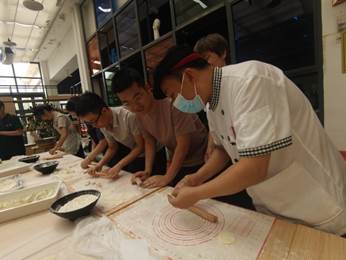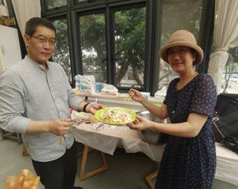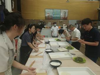 电气工程系党员老师和工会小组老师将饺子宴的食材、水果、冰粉、凉面等准备齐全。校园时光餐吧的师傅们也帮着和面、拌馅,其他老师们到达活动现场后,马上系好围裙、拿起面杖,搓起冰粉、拌起凉面,好不热闹。