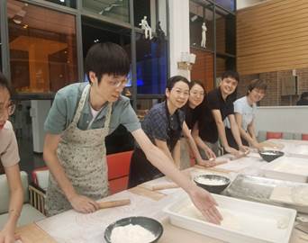 在准备饺子宴过程中,校园时光餐吧的师傅们为青年老师提供技术指导,示范包饺子的技巧。赵书记、肖院长也一边包饺子一边与老师们聊家常、谈美食。大家在一片欢声笑语中渡过了一个愉快的中午。