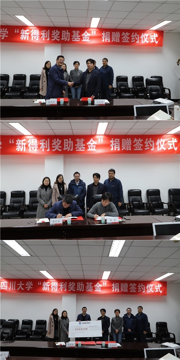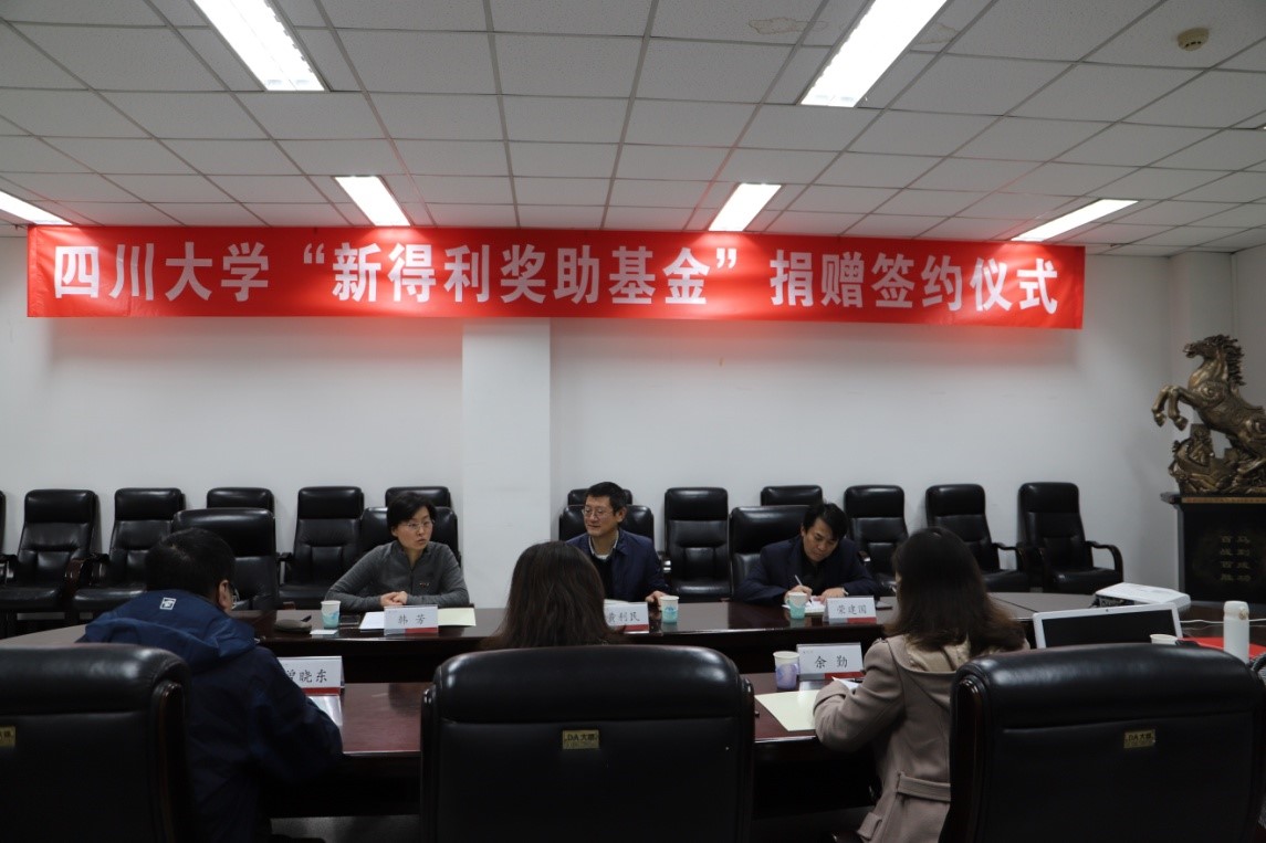 2018年11月19日下午2:30,四川大学“新得利奖助学金”捐赠签约仪式在望江校区基础教学楼A220会议室举行。成都新得利电子有限公司董事长黄利民、四川大学教育基金会秘书长荣建国、四川大学电气信息007足球