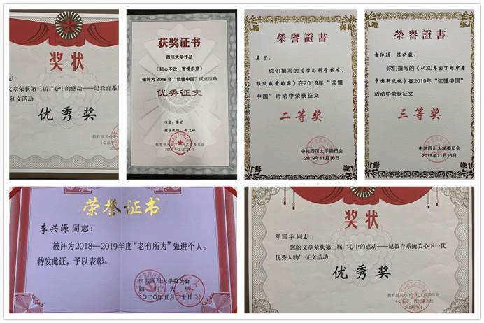 李兴源和张述芳两位老师荣获四川大学2018-2019年度“老有所为”先进个人奖,郝飞婷老师指导、莫贤同学完成的作品《初心不改 寄情未来》被评为2018年教育部“读懂中国”试点活动优秀征文,莫贤同学撰写的《学好科学技术,报效我爱的国》在四川大学2019年“读懂中国”活动中荣获征文二等奖,雷倬玥、陈妍凝同学撰写的《从30年园丁眼中看中国新变化》在四川大学2019年“读懂中国”活动中荣获征文三等奖,邓丽华老师、黄施瑞同学的文章荣获《心系下一代》杂志社第三届“心中的感动——记教育系统关心下一代优秀人物”征文活动优秀奖。
