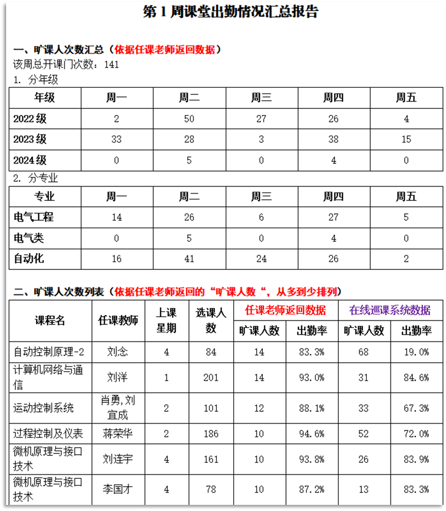 开设课程的授课情况,并且要求任课教师课堂中严格进行考勤,并在课后及时向教学科上交缺勤学生信息。教学科逐日汇总后转给学工组,以便及时发现异常,通知相关人员进行整改。