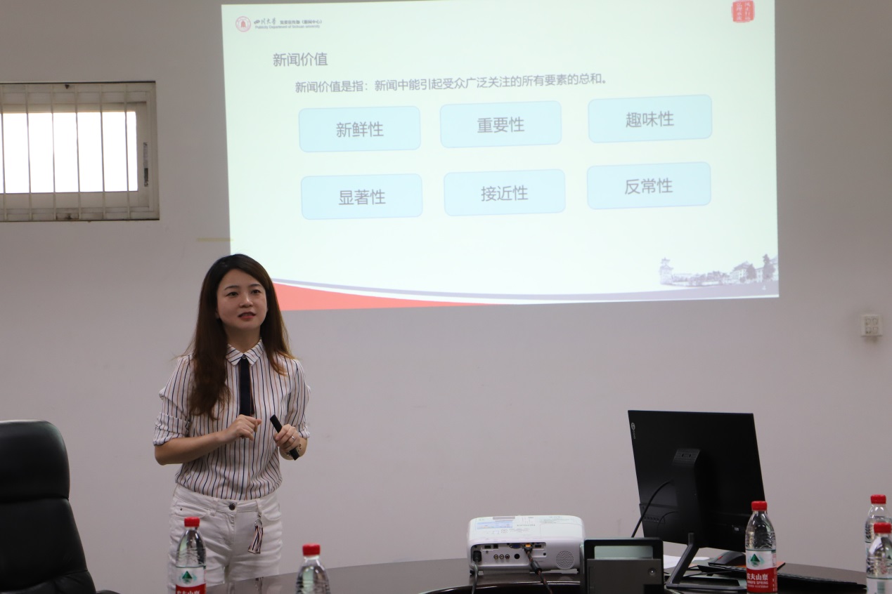培训会上,龙莉老师围绕“新闻策划与新闻采写”,从新闻的定义、新闻价值、新闻策划、新闻写作四个方面为现场师生进行了详细的讲解。针对新闻价值的新鲜性、重要性、趣味性、显著性、接近性和反常性,她运用《四川日报》《人民日报》中的典型案例,以风趣幽默的语言,深入浅出地阐述了新闻价值的这些特点。在与会师生重点关注的新闻写作方面,她也以日常宣传工作案例重点介绍了新闻写作的基本原则、体裁、类型与要求,为如何写好新闻提出了许多建设性意见。