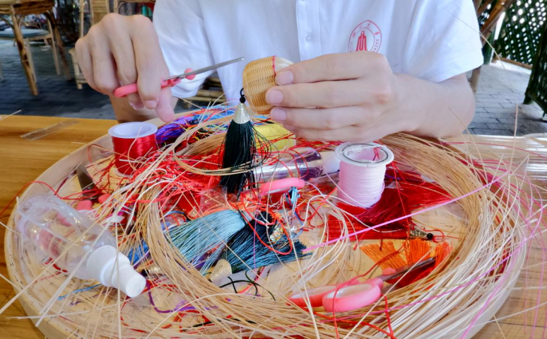而成都市崇州的“道明竹编”,同样应该被更多人了解到并传承下去。“道明竹编”是四川省崇州市道明镇的特产,同时也是国家非物质文化遗产、国家地理标志性产品。团队在参观完道明竹艺村内的竹编博物馆后,进入了著名的“红梅体验馆”,跟随编竹的工匠,学习制作竹扇、竹铃铛等竹编工艺品,在制作过程中感受到了竹编的繁琐,在体验馆师傅的耐心指导下,成员们最终成功制作了自己的竹编手工,感受到了非遗竹编的魅力。通过与竹编匠人和竹艺村村民的交流,了解了国家非物质文化遗产“道明竹编”约4300年的漫漫历史及竹编发展现状,感受到了国家在乡村振兴与传统文化结合的探索。