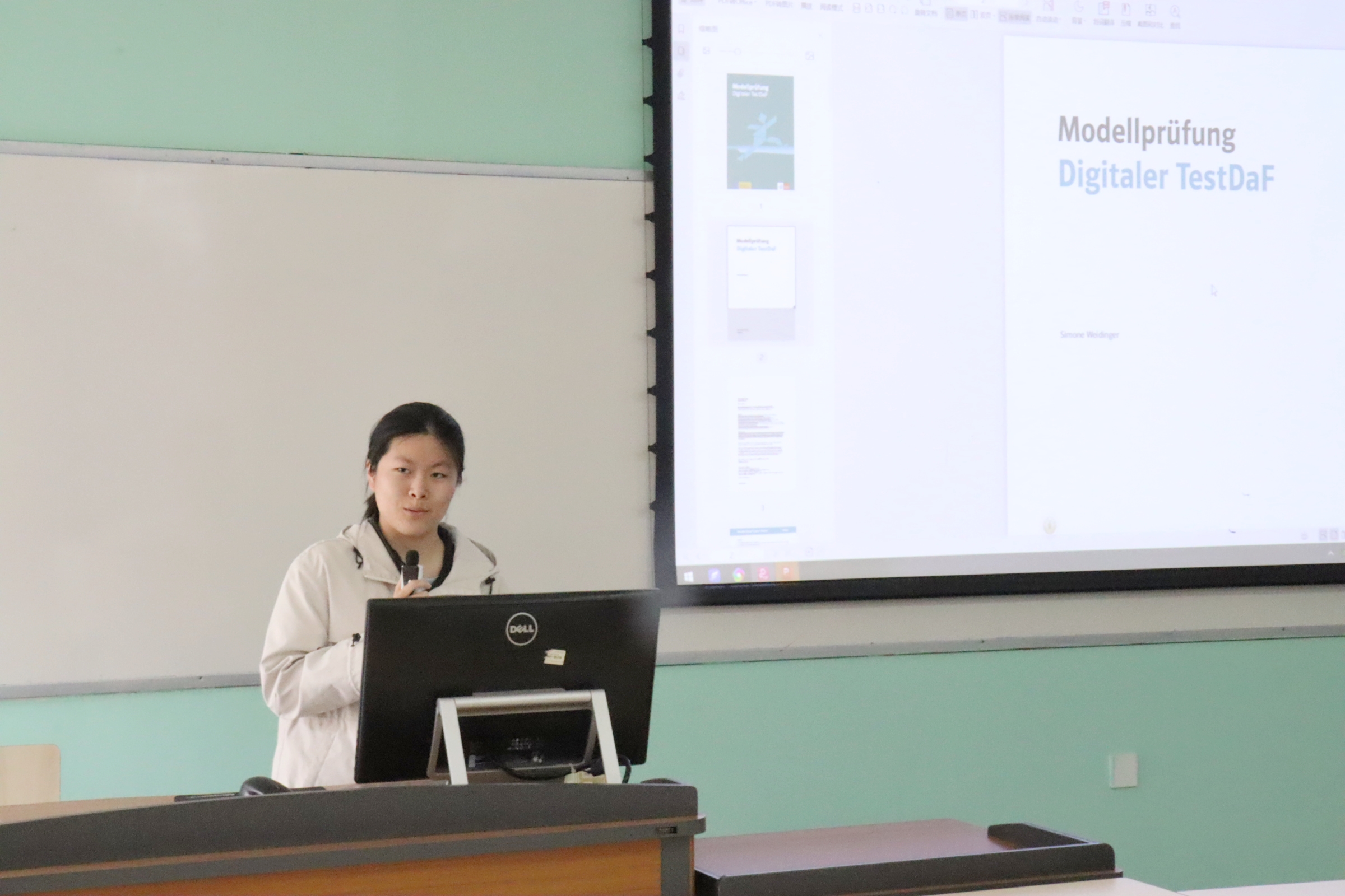 在分享会上,张同学先对 TestDaF、DSH 以及 telc C1 Hochschule 这三种被本项目认可的德语水平考试进行了简要介绍,接着说明了TestDaF考试的时间、地点及形式。随后,她以TestDaF模拟题为例,对阅读、听力、写作及口语四个板块进行了详细解读,包括题型介绍、难易程度分析等并分享了自己的备考与应试经验。她建议学弟学妹们在德语学习中,应拓展课外阅读,结合语境理解单词;听力训练时,同步进行口语跟读练习;写作方面,则要注重日常积累。