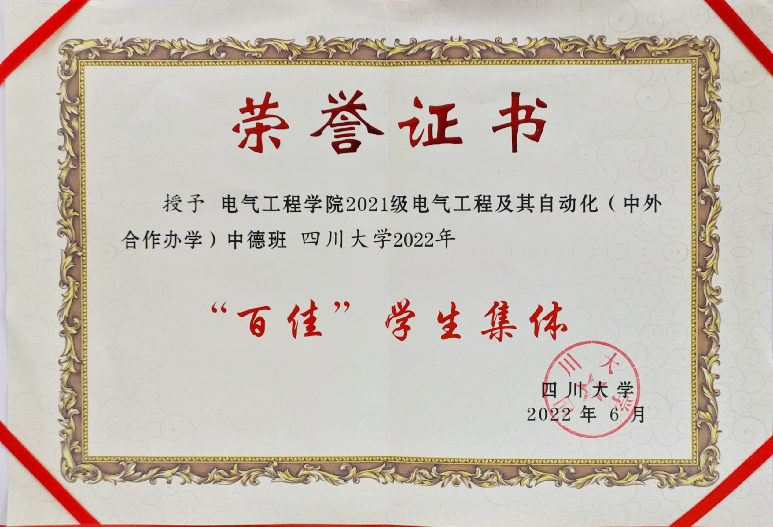 2021级中德班获评“四川大学2022年百佳学生集体”荣誉称号。