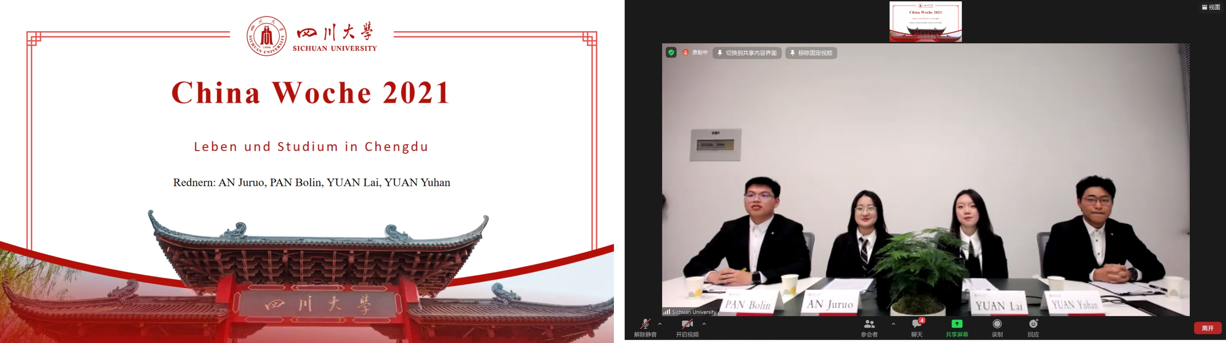 中德班学生充分利用四川大学与德国克劳斯塔尔工业大学的国际合作交流平台,积极参加国际交流活动。中德班安举若、潘博林、袁来和袁钰涵四位同学参加了克大第四届“中国周”的“学生主题日”,并作了题为“在成都的生活及学习”的德语线上报告,活动主办方给予了高度评价,报告取得了良好反响。