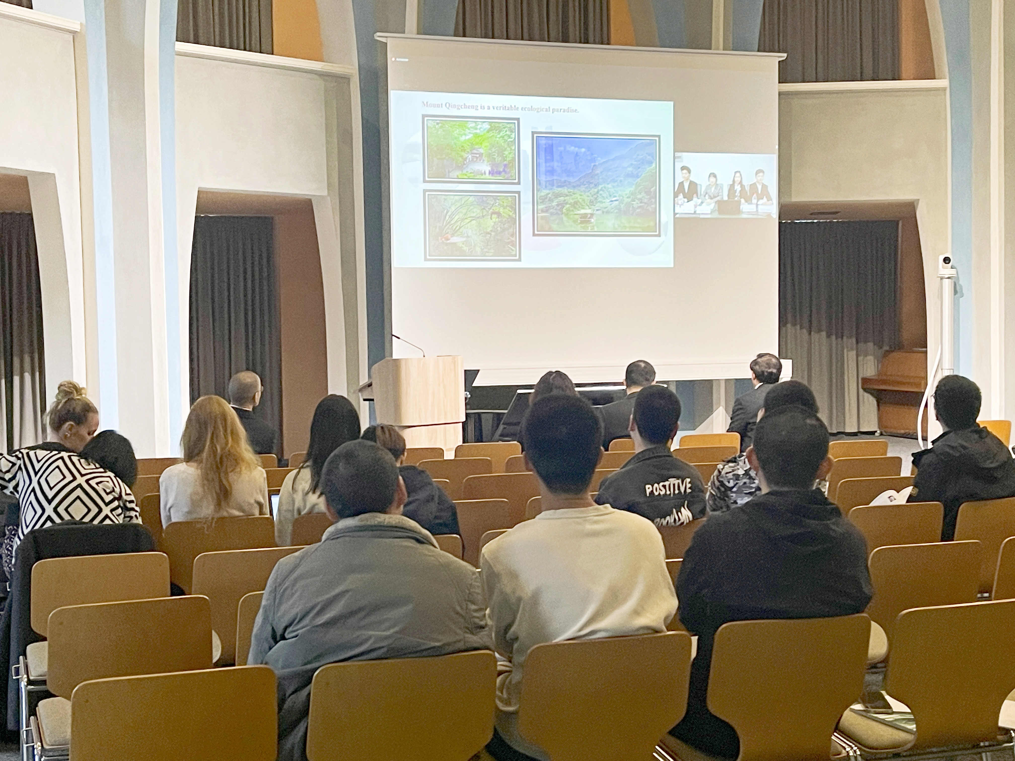 从青城山到天府绿道,从川剧艺术到麻辣美食,杨轶帆和孙语然两位同学结合PPT为大家介绍了成都的美食与美景,带大家领略了成都的风土人情。随后,李昊耘同学分享了校园浓厚的学习氛围以及自身学习德语的初体验。最后,邱思诚同学与大家分享了学校各项体育活动的开展情况以及自己今年在校运会中取得的优异成绩,展现了我校学子的青春活力。