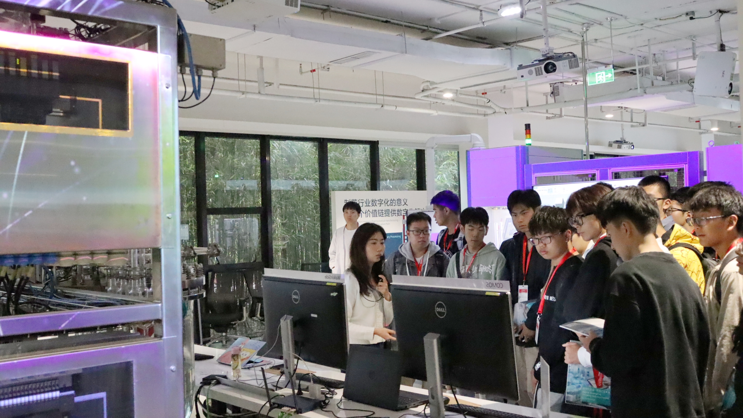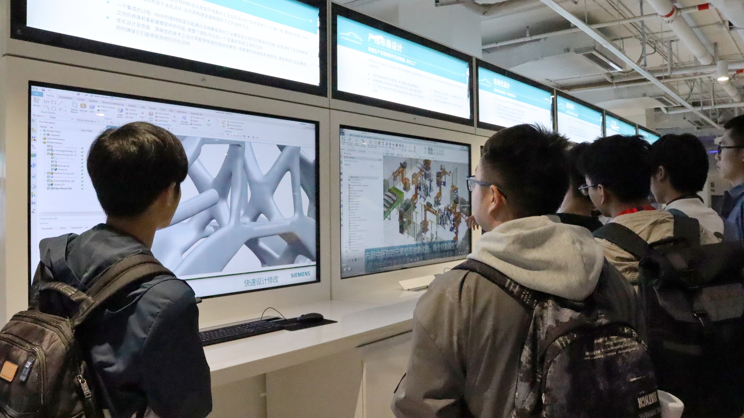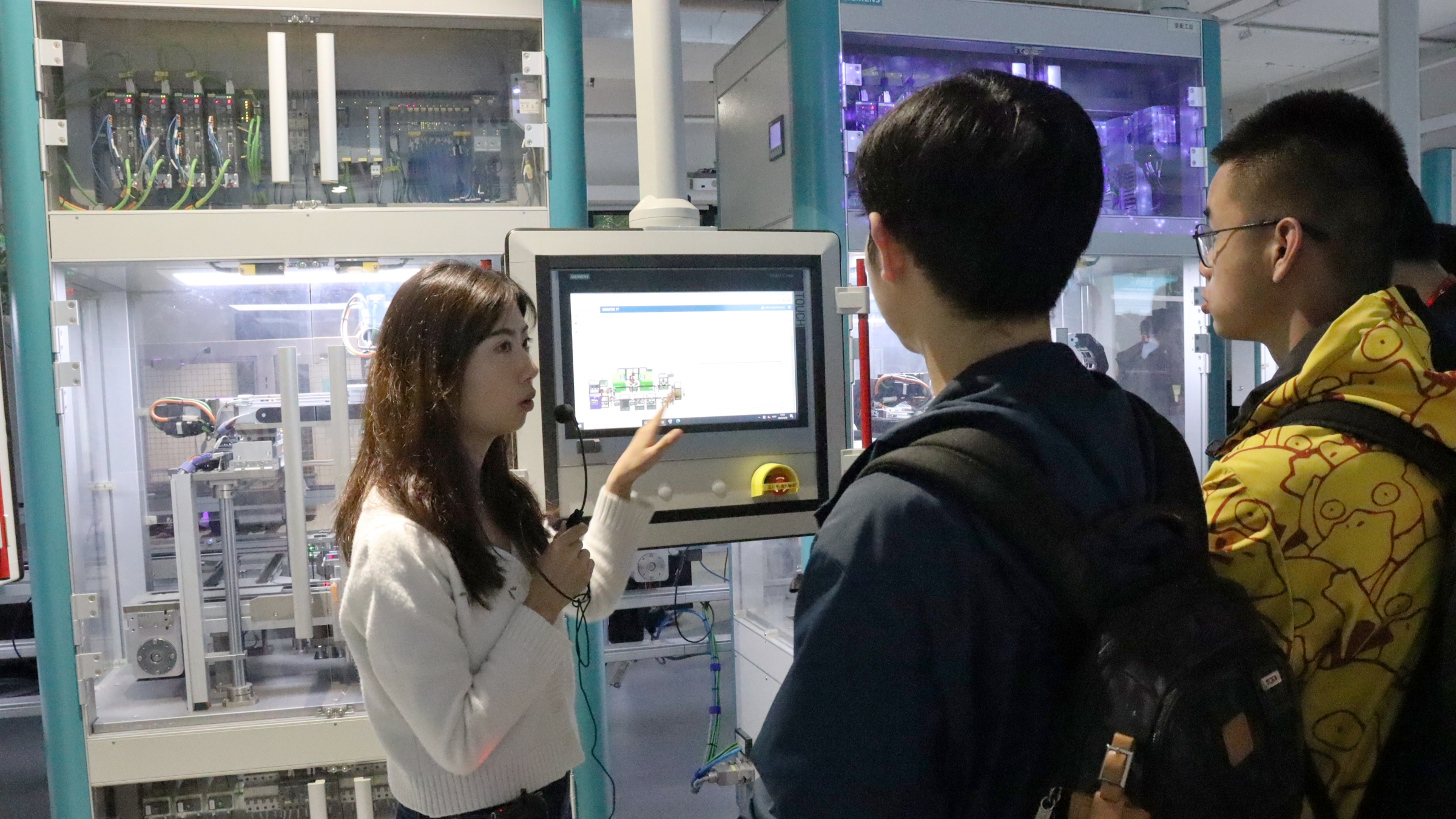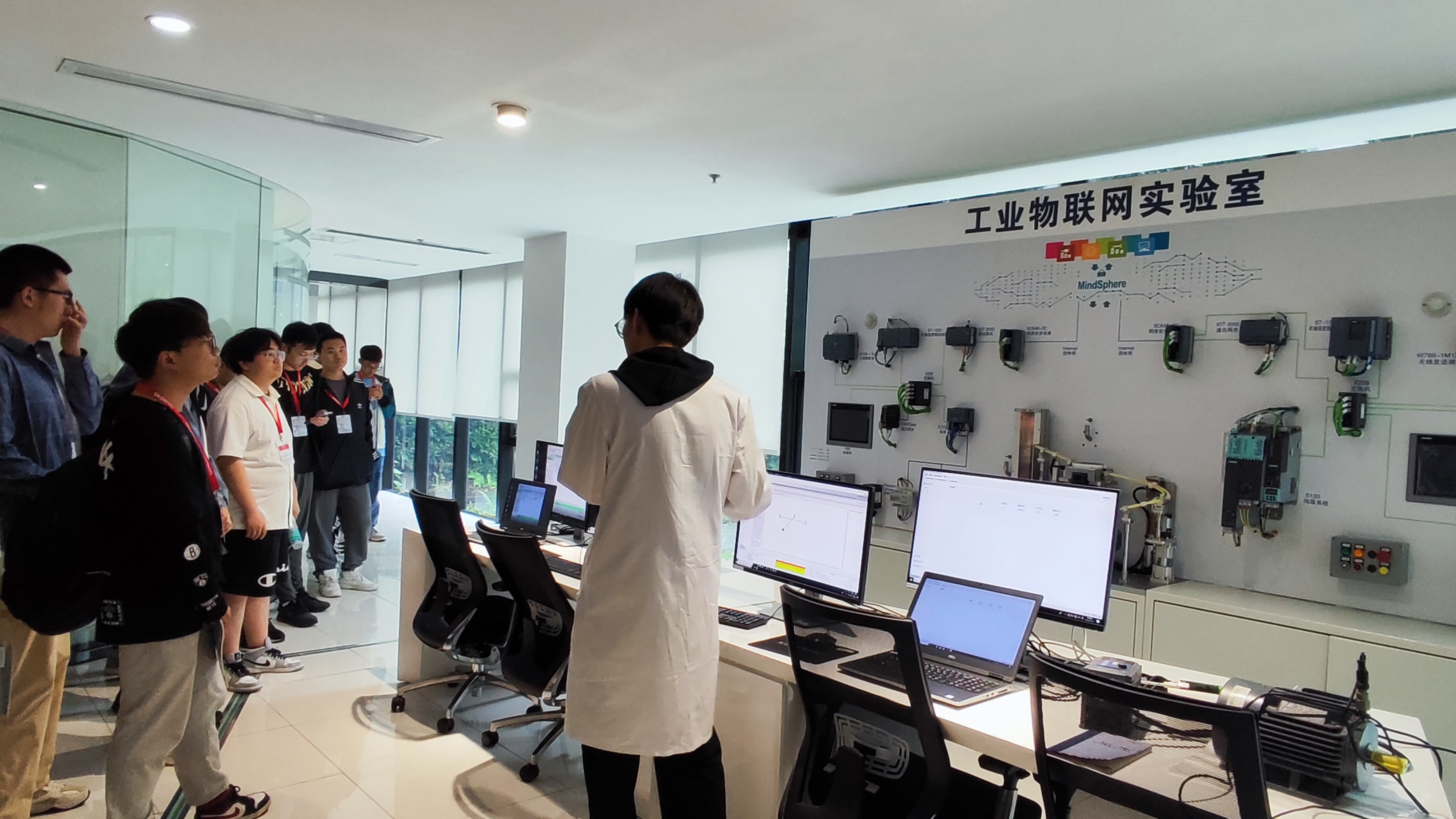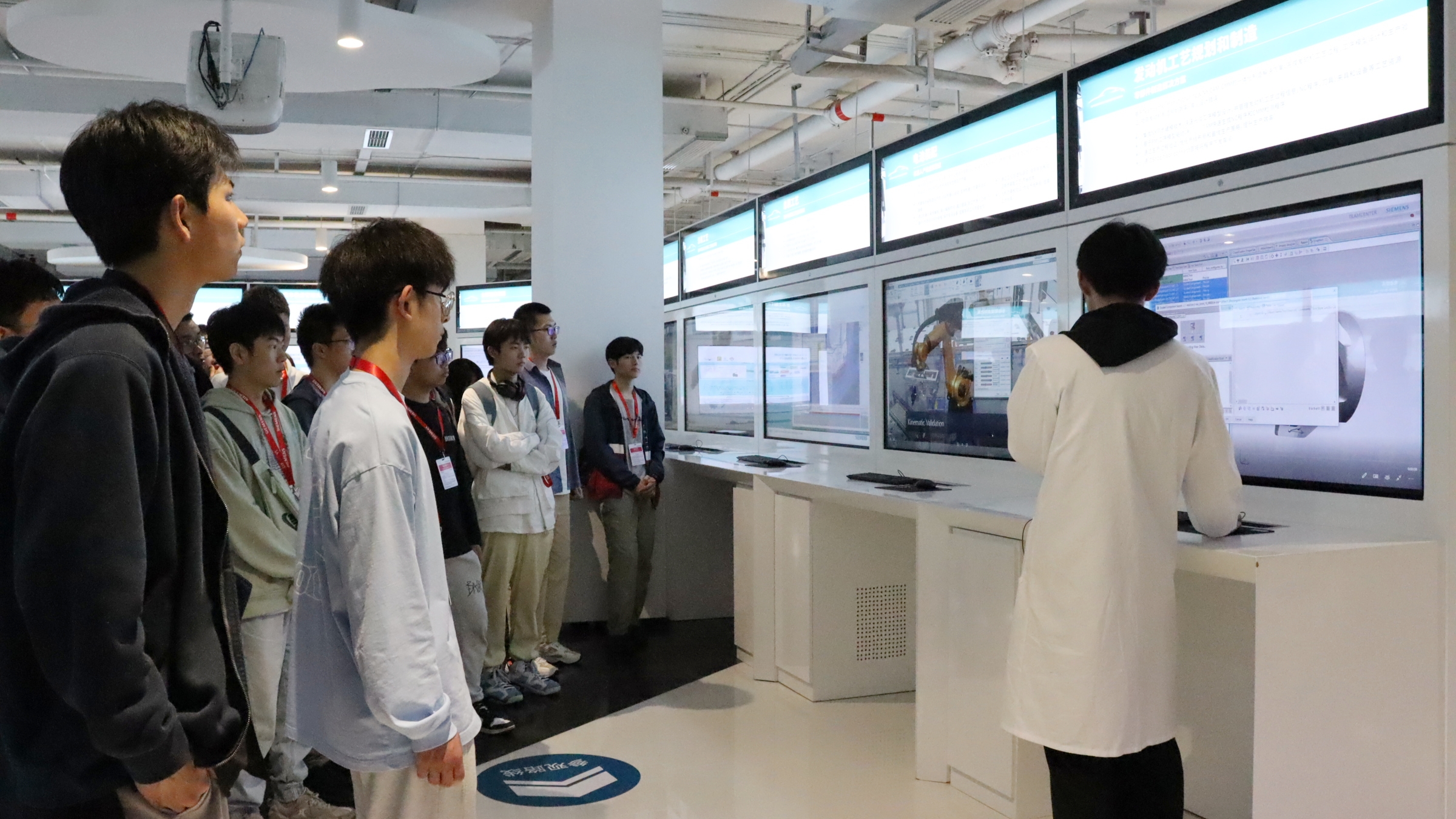 在专业讲解人员的带领下,同学们首先通过影音厅的视频介绍,了解了西门子的企业历史和文化。随后,在数字化企业能力中心,讲解员介绍了西门子数字孪生“验证即生产、实体即数据”的核心理念,并展示了企业产品设计、生产规划、生产工程、生产执行、服务五大环节,让同学们对工业自动化和数字化有了初步的了解。