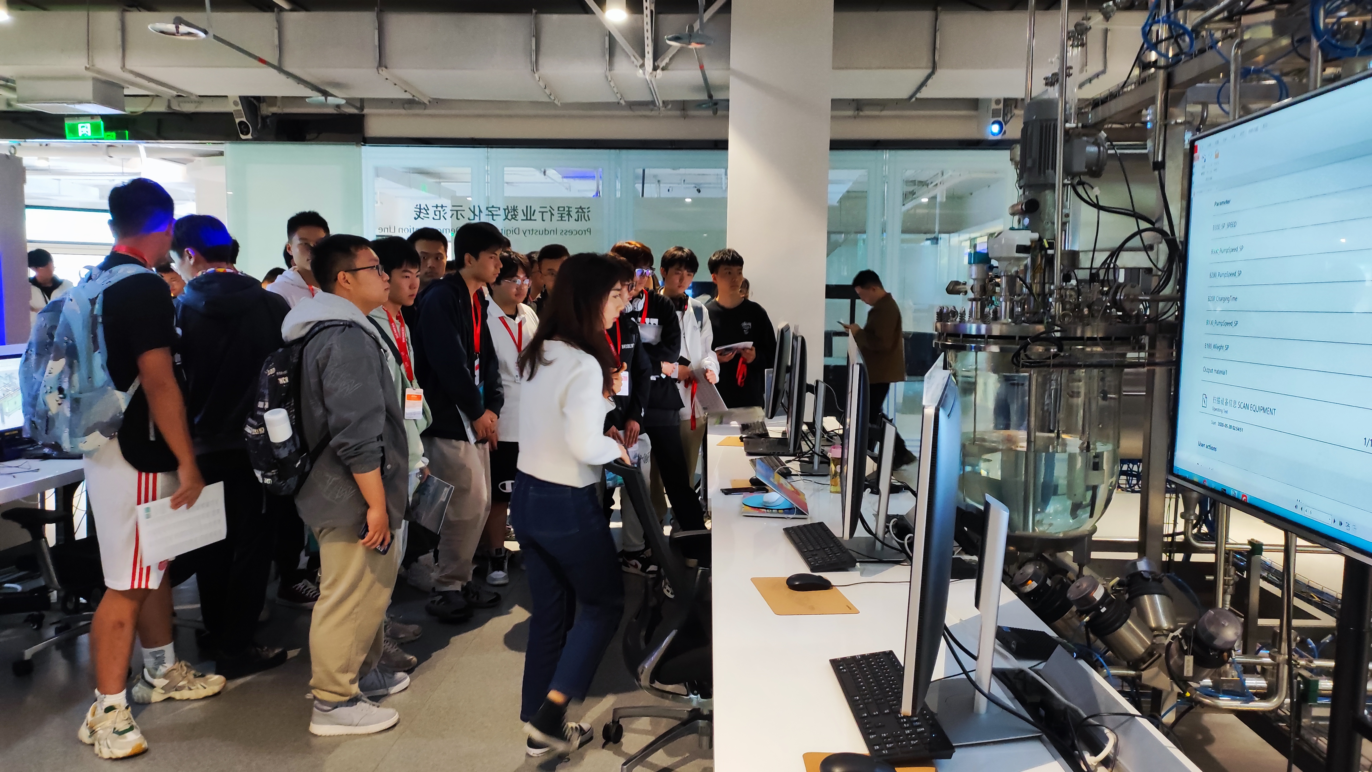 接着,同学们来到了流程行业数字化示范线。通过一台化学合成原料药装置的工艺设备模型,讲解员介绍了以制药行业为代表的流程行业数字化转型趋势,让同学们对数字化控制流程有了直观的了解。
