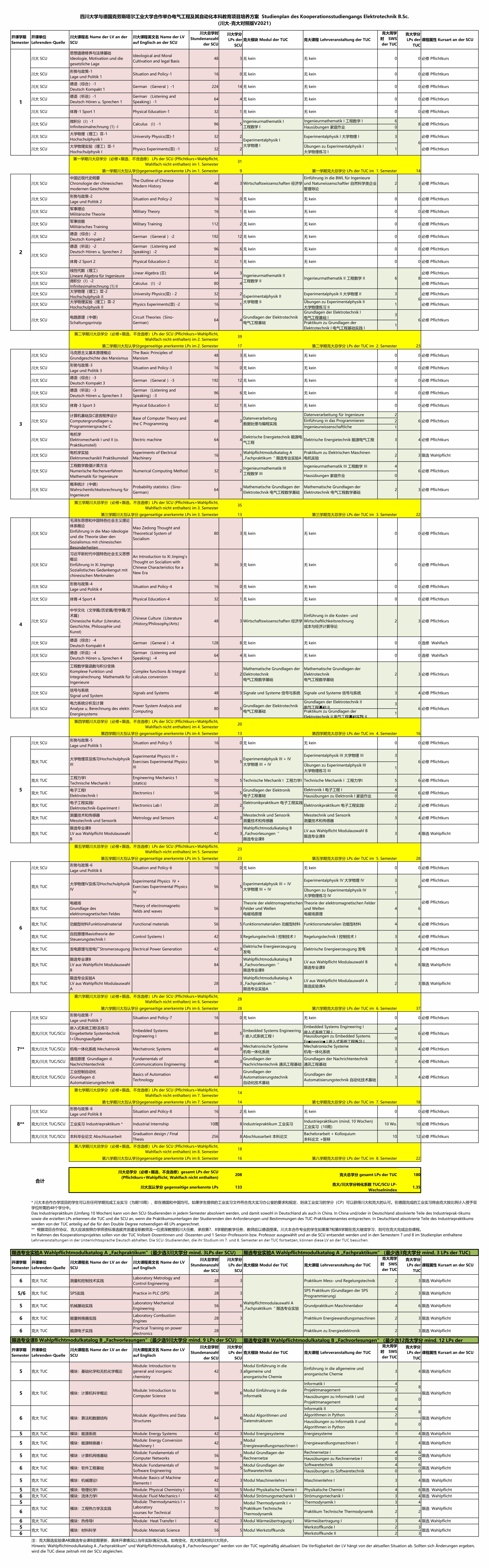 四川大学与德国克劳斯塔尔工业大学合作举办电气工程及其自动化本科教育项目培养方案(川大-克大对照版V2021)