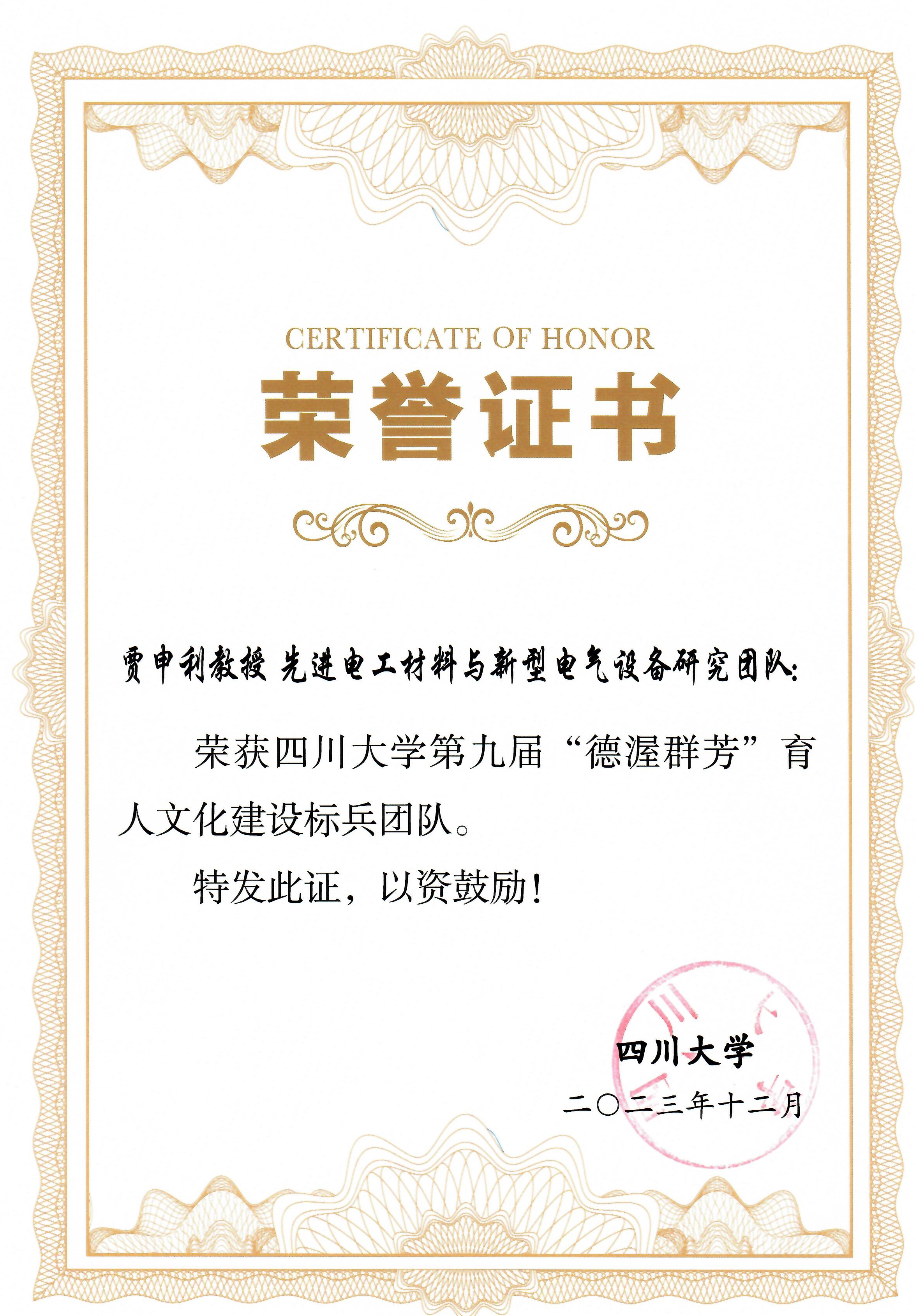 近日,007即时比分 贾申利教授先进电工材料与新型电气设备研究团队荣获“四川大学第九届‘德渥群芳’育人文化建设导师标兵团队”称号。