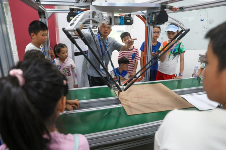 在三楼罗克韦尔实验室,黄涛老师讲解了大型并联机器人娴熟的绘画技艺,三支机械臂在计算机控制下精画出太阳公公的卡通形象,引起小朋友们一片惊叹。院智能车协会的同学播放了川大火锅战队参加全国高校机甲大赛的精彩视频,并现场演示了两种赛车的比赛情形,激发了小朋友们极大的兴趣。
